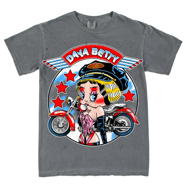 Let's ride, vroom vroom. Biker Betty tee designed by Amado Bermudez-McLaud, printed locally in Los Angeles on premium vintage wash garment.