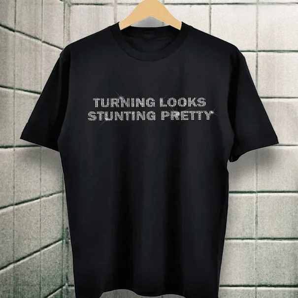 The black crew neck t-shirt features rhinestone text with Aquaria's iconic RuMix line 'turning looks, stunting pretty'.