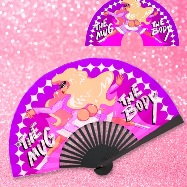 High quality, full color, large satin folding fan featuring the mug, the body, Morphine Love Dion, and her super strong hamstrings- splitting over the center of the fan!
