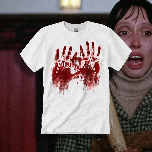 White T-shirt with bloody hand graphic and "erased" AQUARIA logo. Inspired by Alexander McQueen 1994 tank top. Aquaria recommends cutting off the arms and rocking it sleeveless for a more accurately styled look to the reference, though worn as-is works just as well!