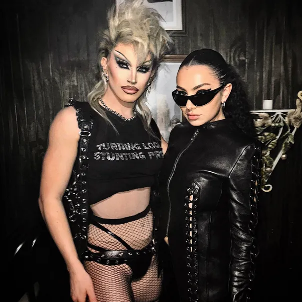 The black crew neck t-shirt features rhinestone text with Aquaria's iconic RuMix line 'turning looks, stunting pretty'.